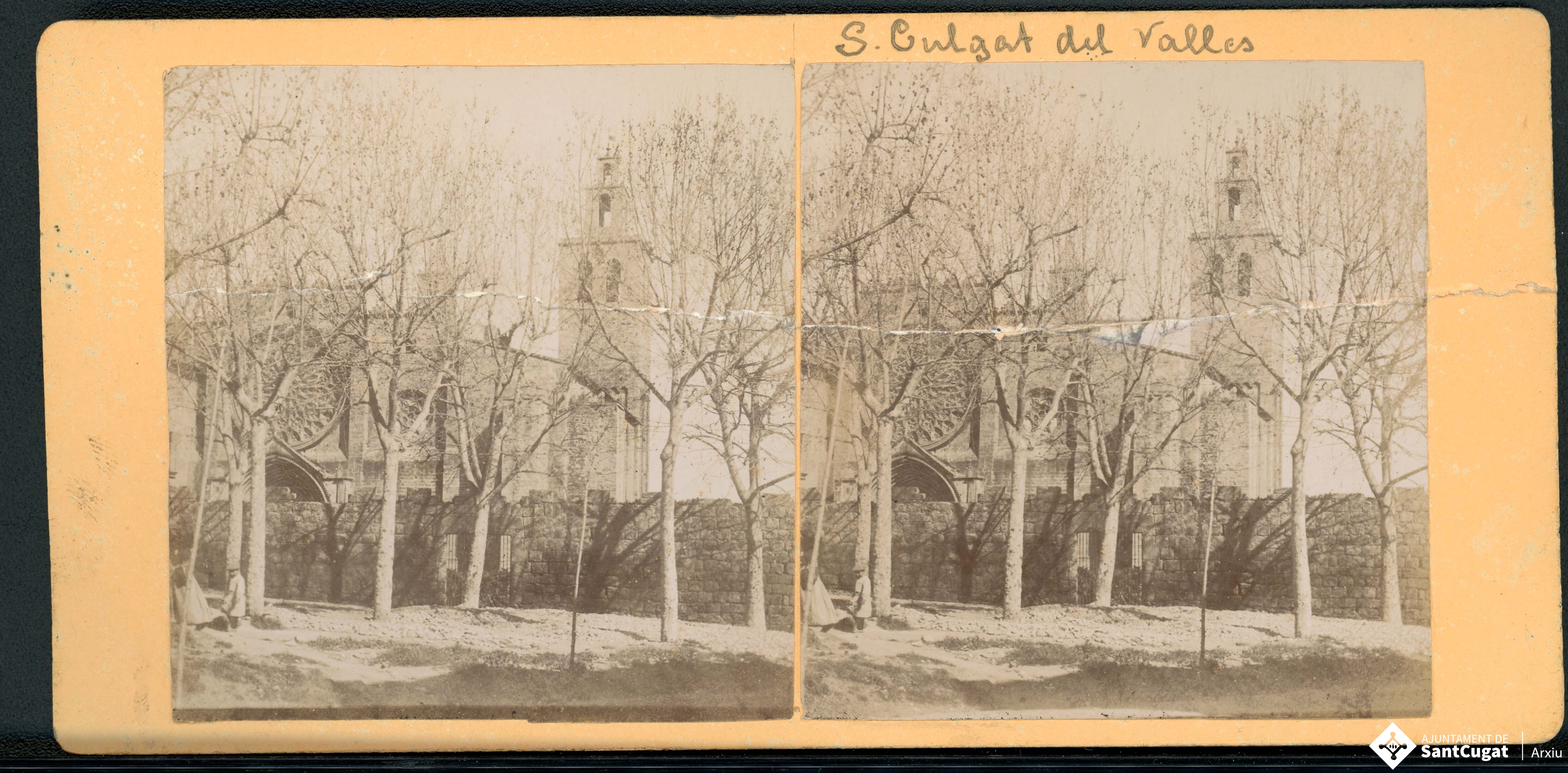 Còpia positiva estereoscòpica amb una vista de la plaça d'Octavià i el Monestir de Sant Cugat del Vallès. Totes dues albúmines estan sobre un suport secundari de cartó de color carabassa, té una anotació manuscrita amb el nom del municipi.