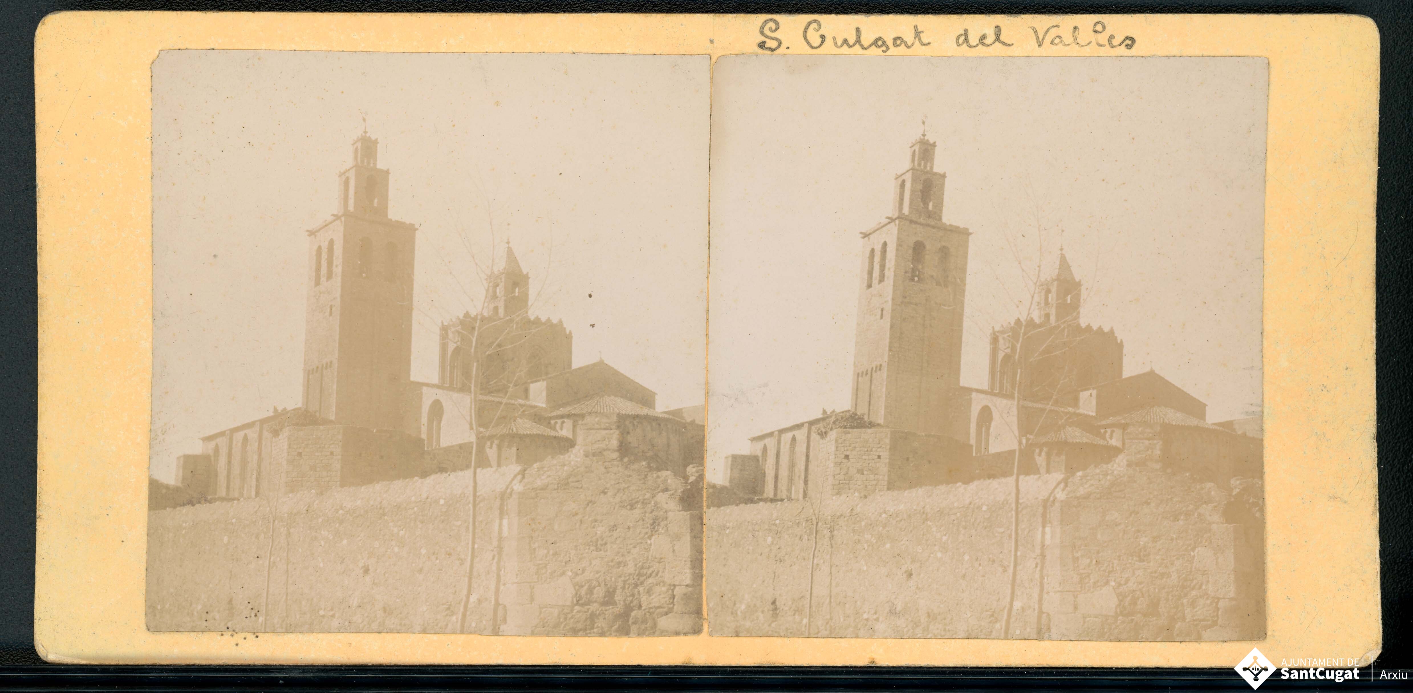Còpia positiva estereoscòpica amb una vista de l'església de Sant Pere d'Octavià del Monestir de Sant Cugat del Vallès. Totes dues albúmines estan sobre un suport secundari de cartó de color carabassa, té una anotació manuscrita amb el nom del municipi.