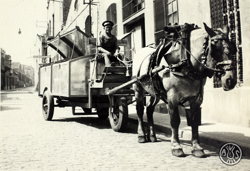 Cavall amb un carro sense guarnir i un noi assegut al carro. Sabadell