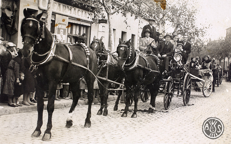 Passada de Sant Antoni Abad per davant d'una farmàcia en un carre sense identificar. Sabadell. Edició postal
