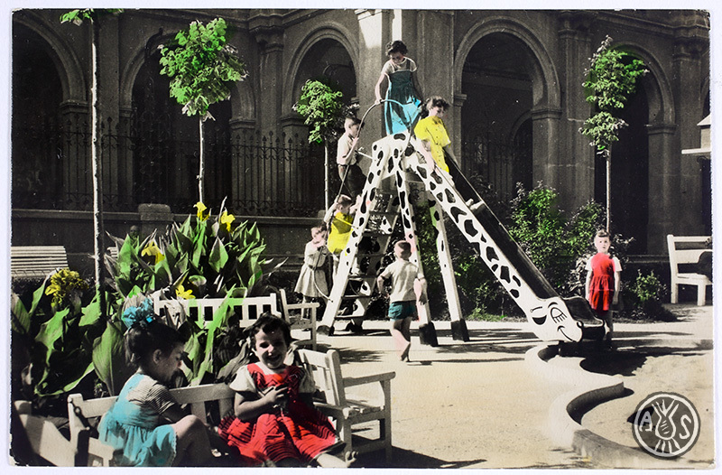 Infants jugant als jardinets de la plaça del doctor Robert. Sabadell. Edció postal