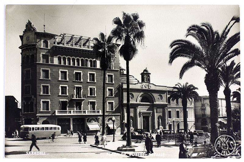 Plaça del Doctor Robert. Al fons l'edifici de la la Caixa de Pensions i l'església de l'Immaculat Cor de Maria (Claretians) o també dita els Padres. Edició postal. Sabadell