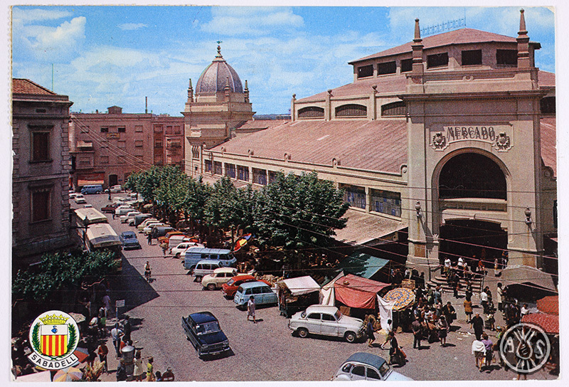 Plaça del Mercat amb cotxes aparactas al voltant. Sabadell. Edició postal
