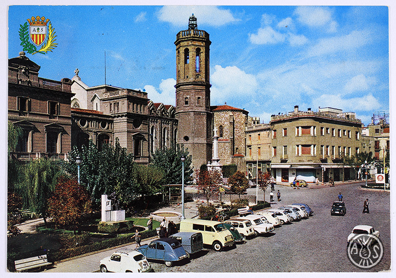 Plaça del Doctor Robert. A l'esquerra els jardinets i el monument a Joan Sallarès i Pla. Al fons el campanar de l'església de Sant Feliu i la creu dels caiguts. Sabadell. Edició postal