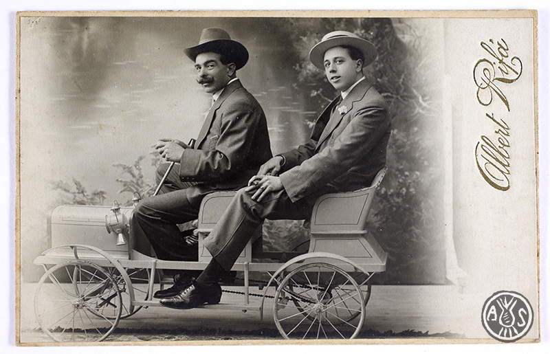 Retrat d'estudi de dos homes sense identificar a dalt d'un cotxe. Sabadell. Edició postal