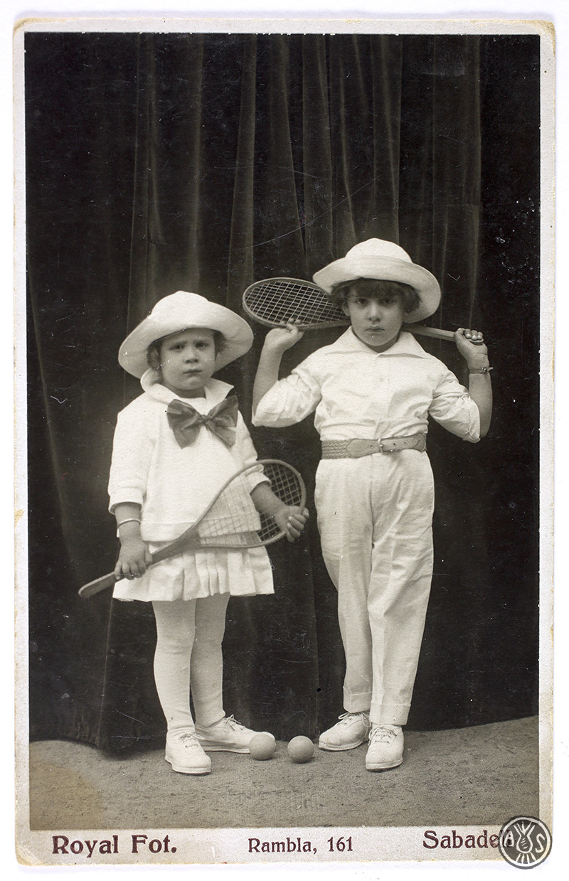 Retrat d'estudi d'un nen i una nena vestits per jugar a tennis amb una raqueta a la mà. Sabadell. Edició postal