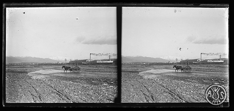 Carro circulant per la llera d'un riu amb un vapor al fons. S.l.