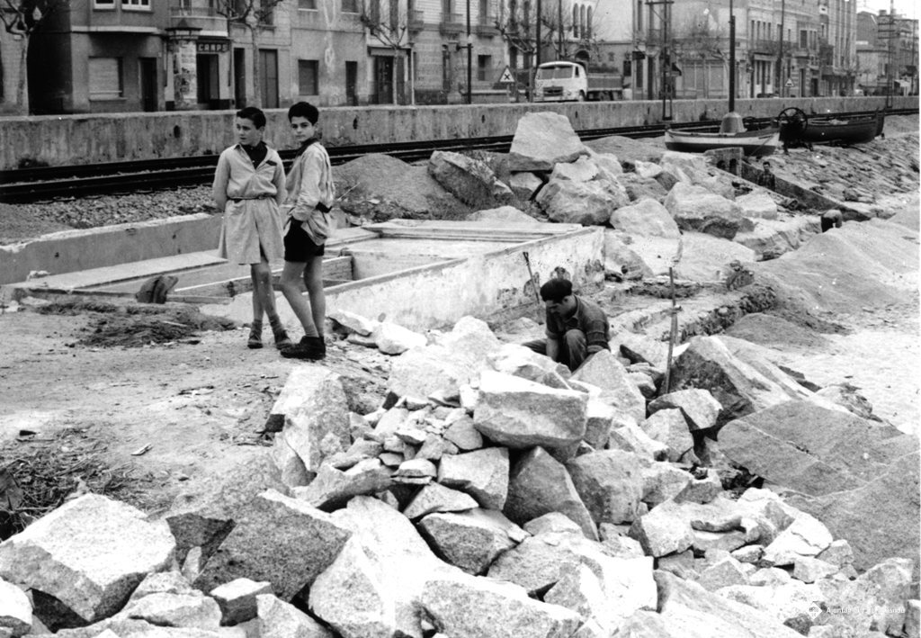 Dos nens amb bata de l'escola a les obres del port. S'hi veu el safareig municipal.