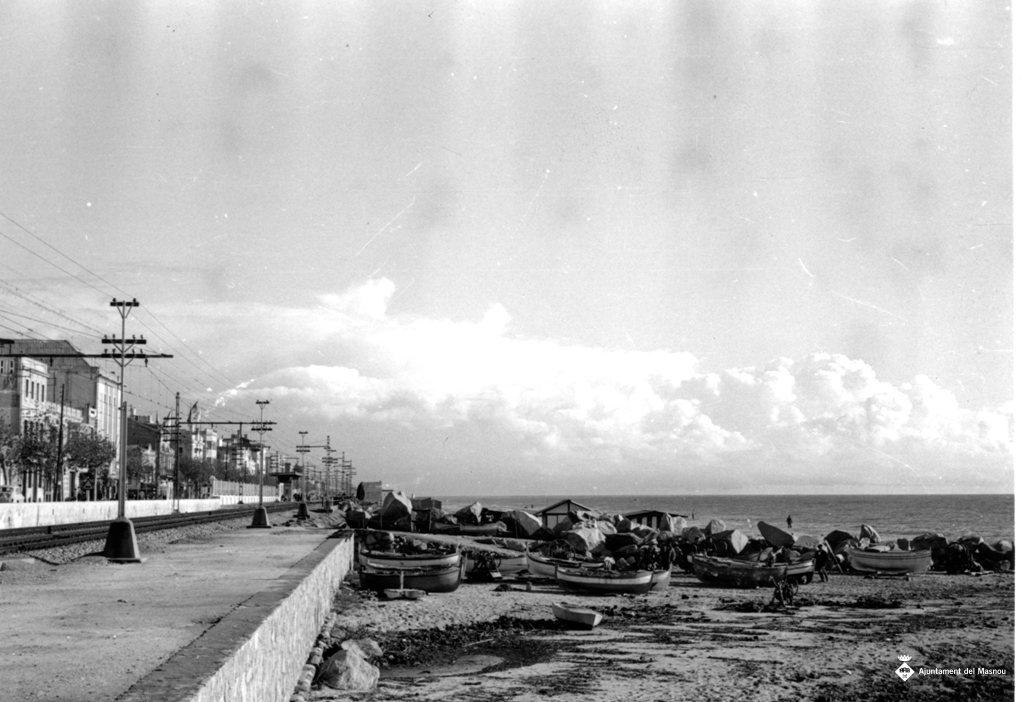 Amb barques varades a la sorra. A l'esquerra hi ha les vies del tren.