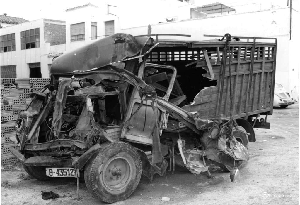 Camió amb el morro aixafat, per un xoc frontal, després d'un accident de trànsit.
