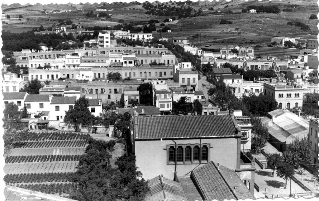 Perspectiva, probablement des del campanar. S'hi veu l'escola Ocata, plaça de Marcel·lina Monteys, carrer de Romà Fabra, Navarra, Itàlia, etc.
