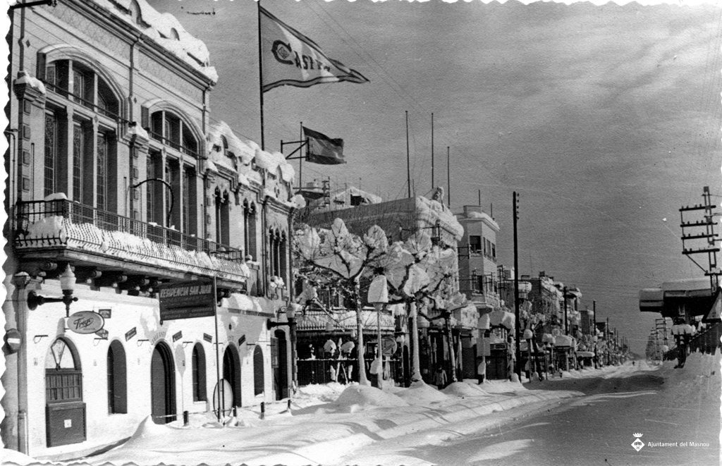 Façanes del Casino i l'Ajuntament coberts de neu.