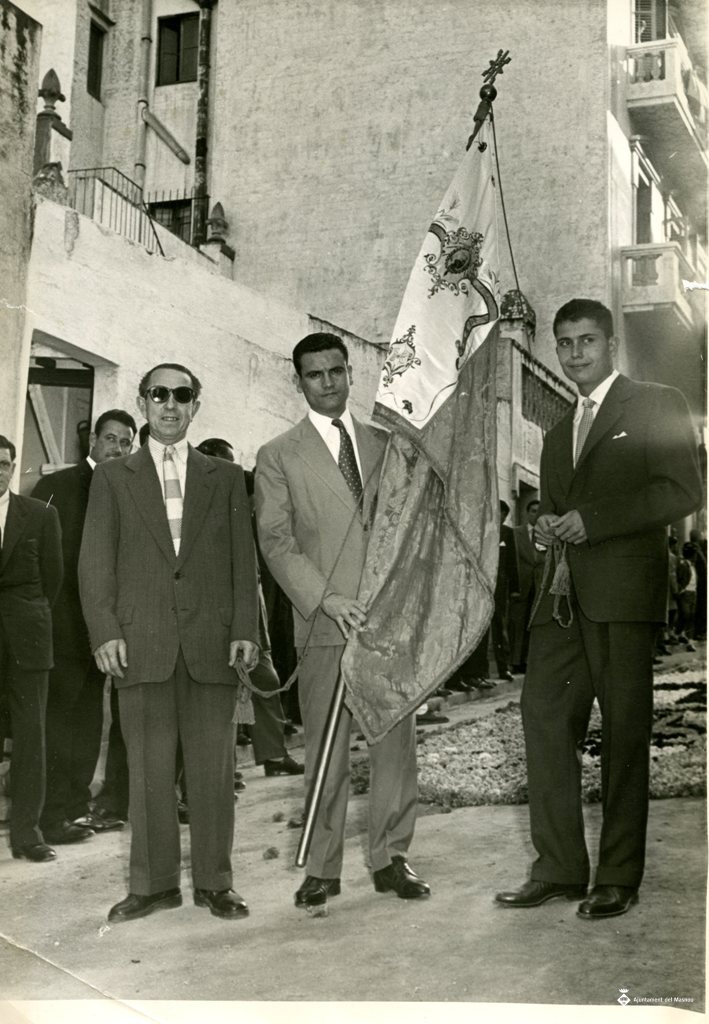 Tres homes sostenint una bandera amb les catifes de flors darrere, al carrer Sant Josep. D'esquerra a dreta: Rafael Bert, ? i Josep Vendrell?.
