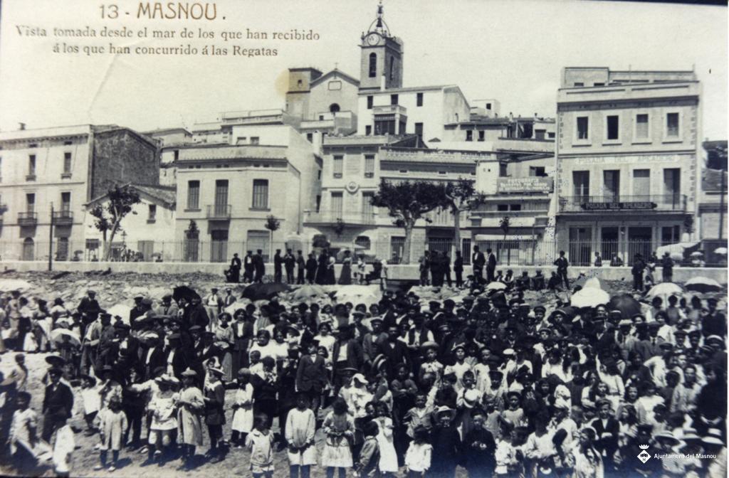 Vista des del mar d'un grup nombrós de gent que van a rebre els participants a les regates. S'hi veu la Posada del Apeadero i la botiga de fotografia El Siglo, i també l'església.