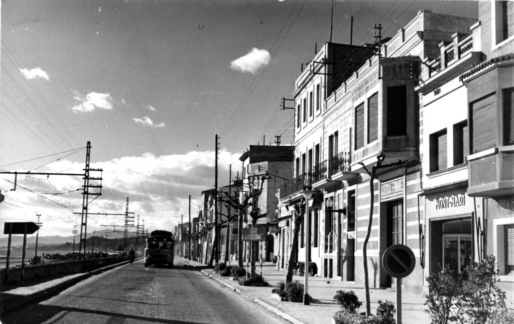 Carretera de Barcelona. Al centre hi circula un camió. Hi ha la botiga Mont-Mari i Gasoses Fernández.