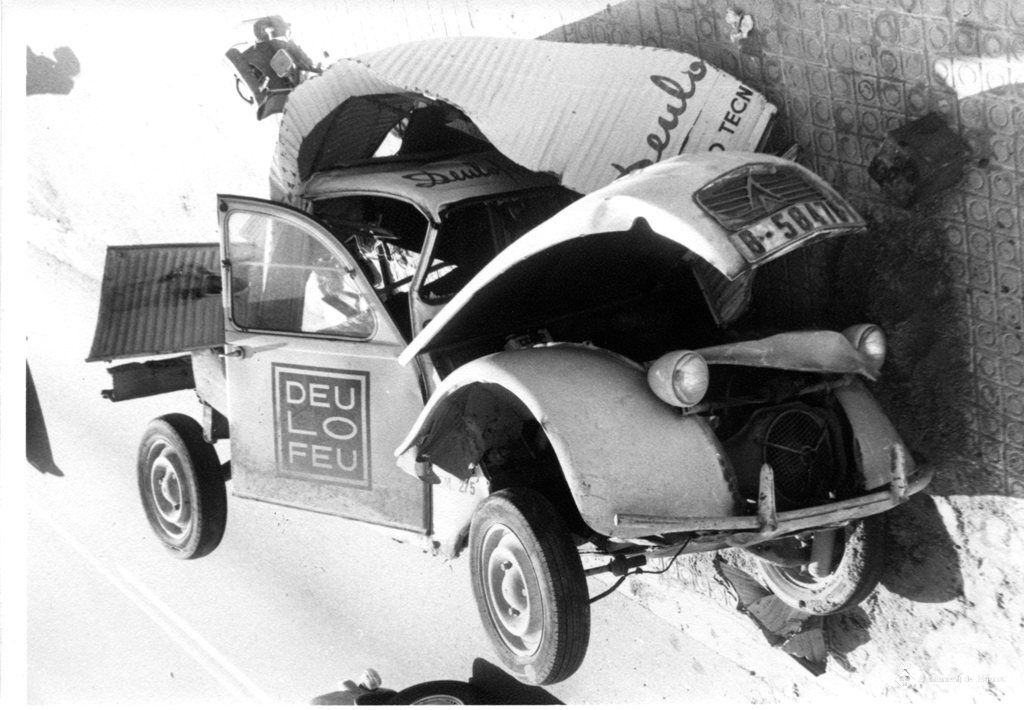 Citroën 2 CV de la casa Deulofeu, tombat de costat sobre la vorera després d'haver patit un accident.
