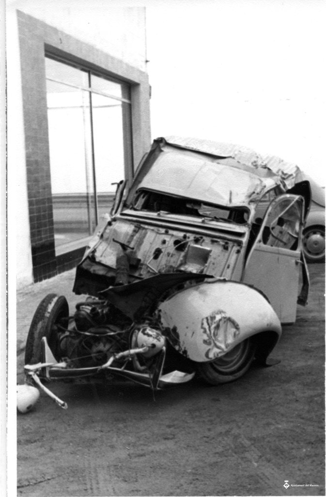 Cotxe que ha patit un xoc frontal. El morro li ha desaparegut del tot.
