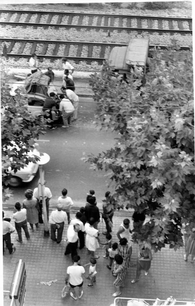 Accident de trànsit a la carretera de Barcelona, en la qual hi ha implicat com a mínim un Seat 600. Un grup de gent és al voltant del cotxe i un altre grup bada des de la vorera.