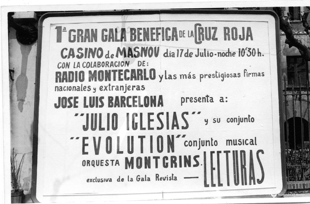 Anunci enganxat a les reixes del Casino de la Primera Gran Gala Benèfica de la Creu Roja que es celebraria al Casino el 17 de juliol. Hi ve Julio Iglesias.