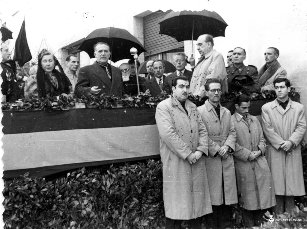 Acte públic amb les autoritats sobre una tribuna. Alcalde Leonarte.