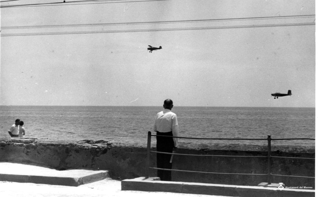 Un home d'esquenes mira dues avionetes que volen sobre el mar.