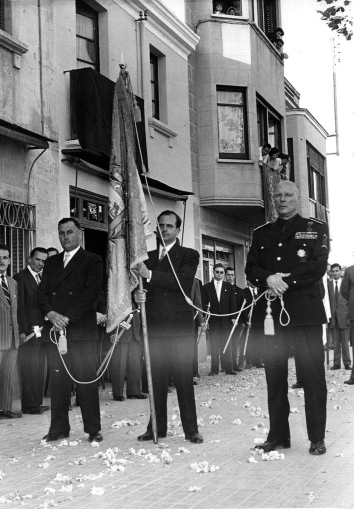 Tres homes portant una bandera a la processó de Corpus. El de la dreta és Francesc Pagès, àlies Ceset.