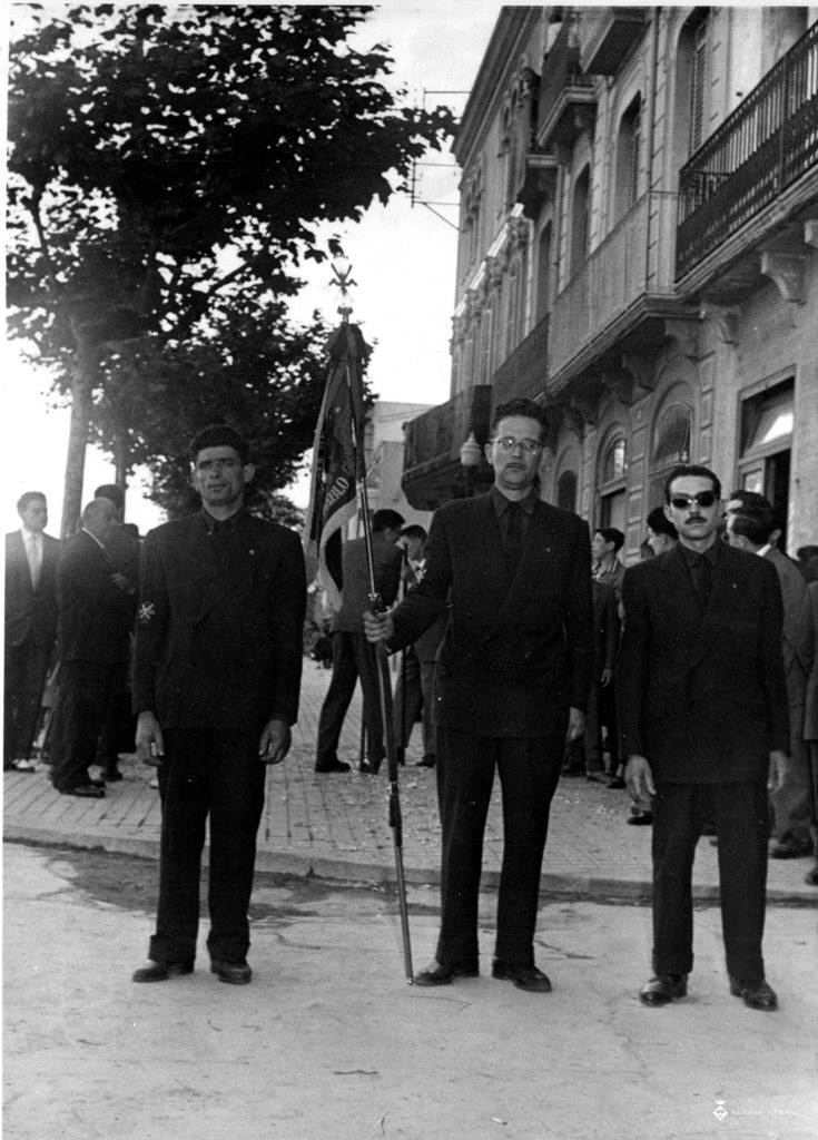 Tres membres de la Guardia de Franco (centúria Pablo Capella) amb la seva bandera el dia de Corpus. Al centre Josep Prats Bernet.