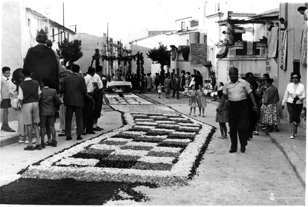 Catifes de flors al carrer durant el Corpus. A l'esquerra hi ha gegants.