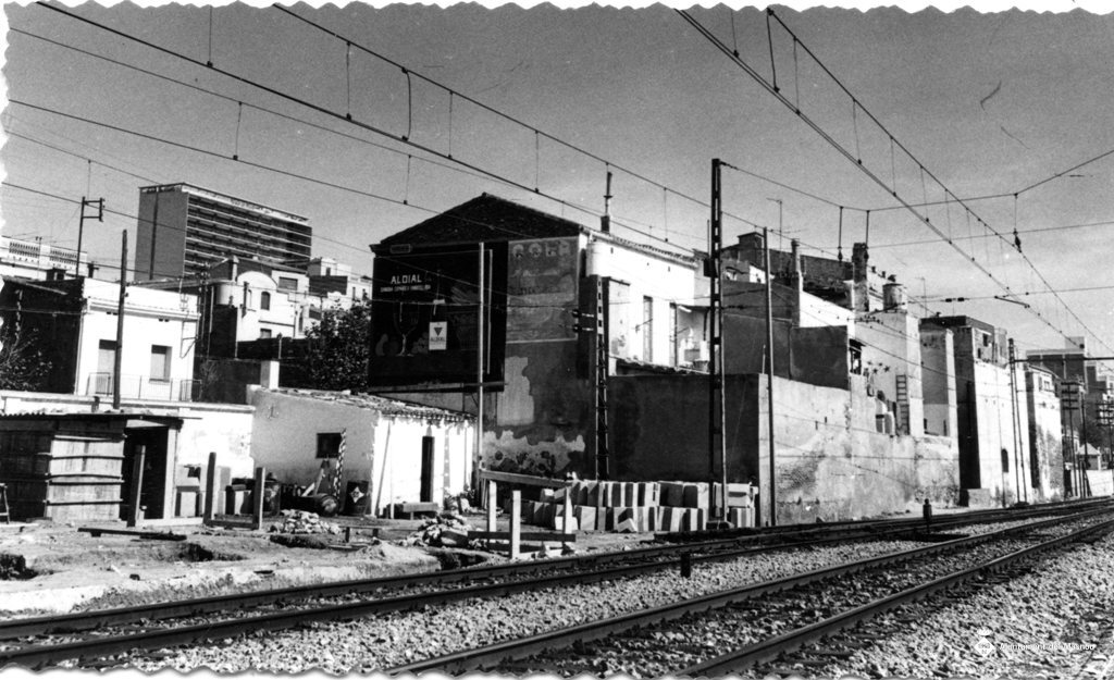 Conjunt d'edificis entre les vies i la carretera, vistos des de les vies de tren. A l'esquerra de la imatge, un solar amb obres.