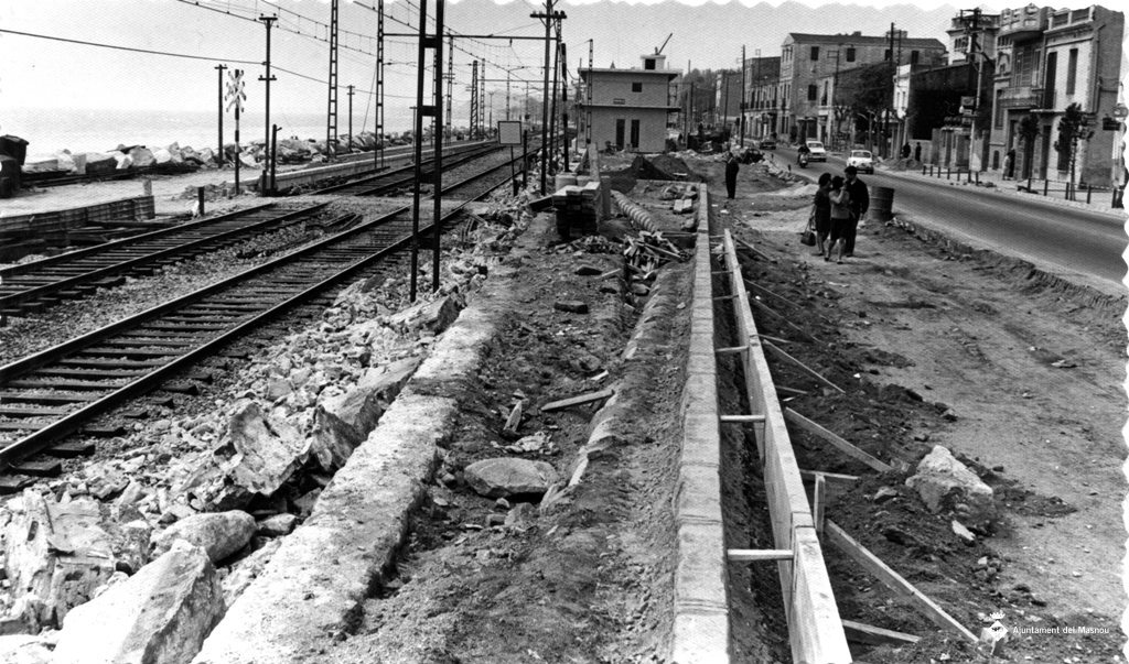 Obres entre la carretera i les vies del tren, a prop de l'estació del Masnou.