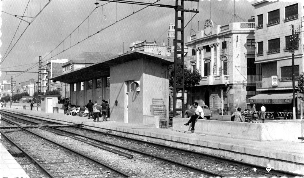El baixador d'Ocata acabat de construir, vist des de la via del tren. Darrere seu, la façana de l'Ajuntament.
