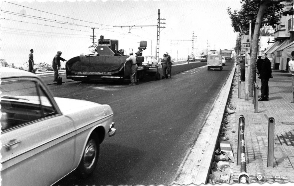 Un grup d'obrers amb una gran màquina estan abocant l'asfalt a la via.
