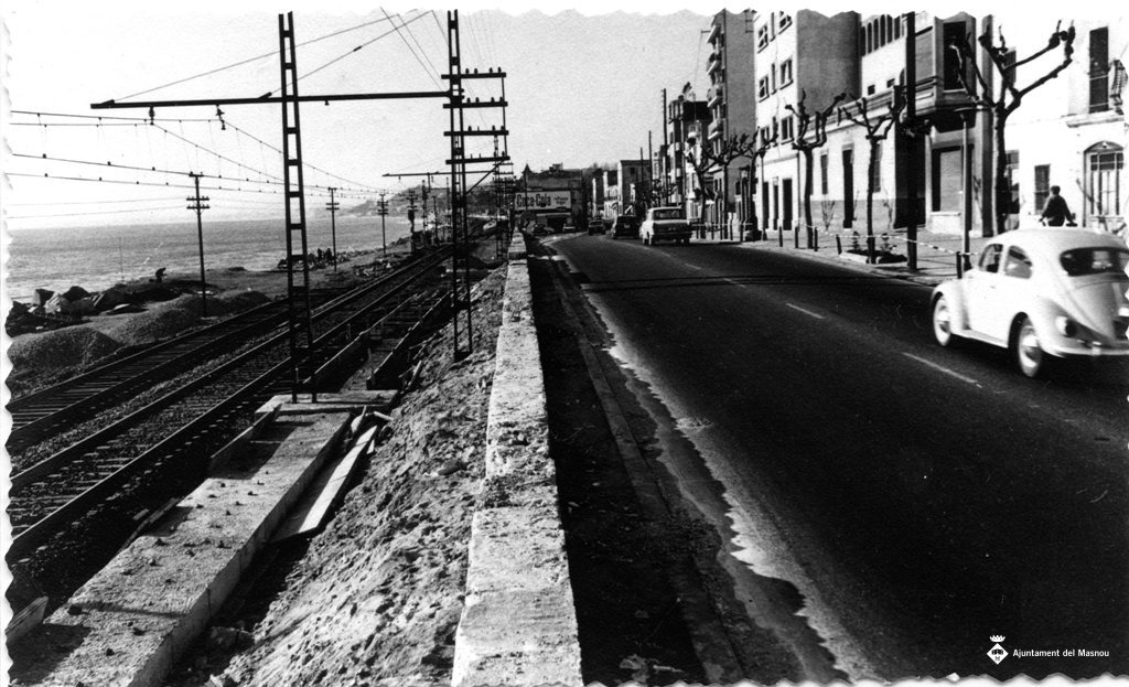 Al fons es veu l'edifici amb l'anunci de Coca Cola que hi havia entre carretera i vies.