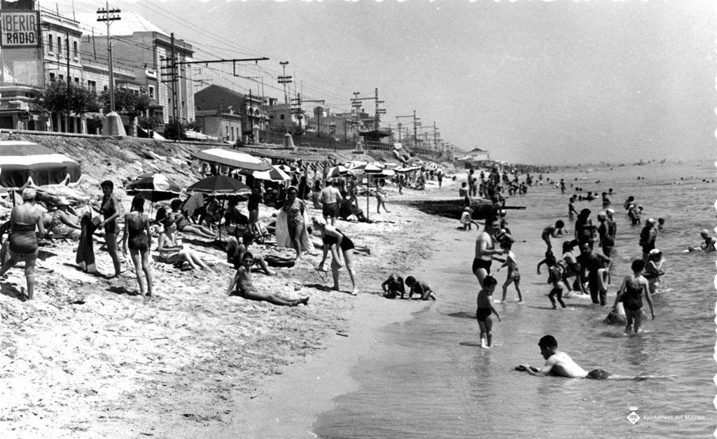Platja un dia d'estiu plena de banyistes, a l'alçada del Casinet.