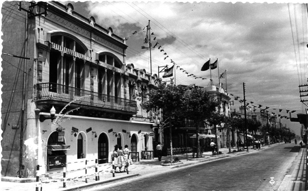 Al fons el Casino i l'Ajuntament amb les banderes desplegades al capdamunt. A la dreta, part de la coberta del baixador d'Ocata. Unes banderoles travessen la carretera.