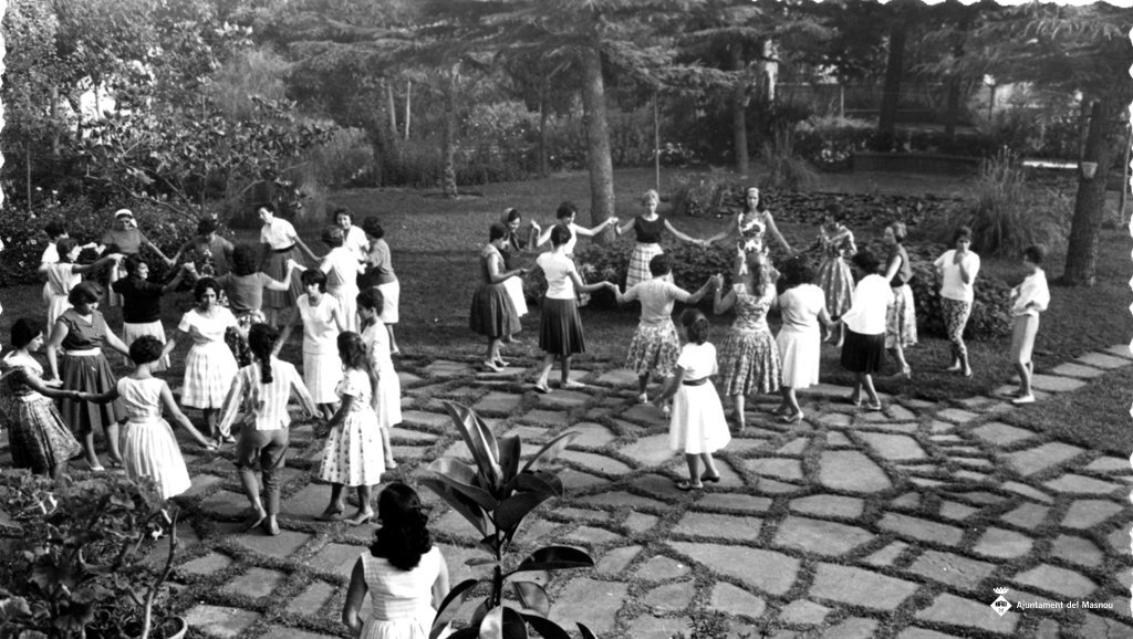 Grup de dones de la Sección Femenina ballant sardanes als jardins de l'Alberg.