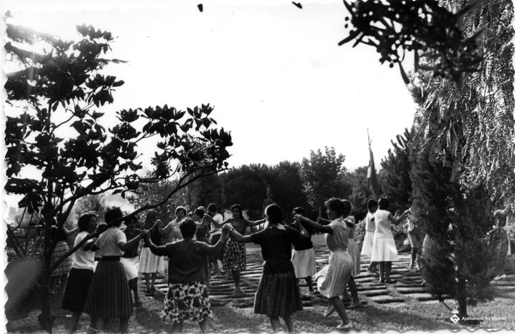 Grup de dones de la Sección Femenina ballant sardanes als jardins de l'Alberg, visió lateral.