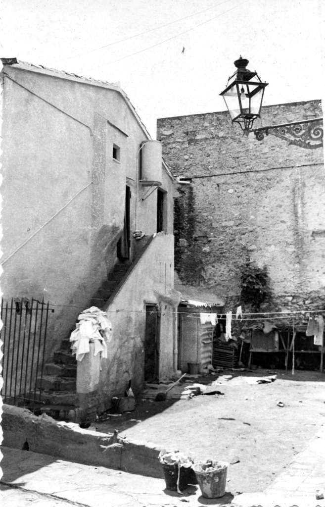 Una escala puja a la porta d'entrada de la casa. En primer terme hi ha un fanal de carrer d'Anselm Clavé.