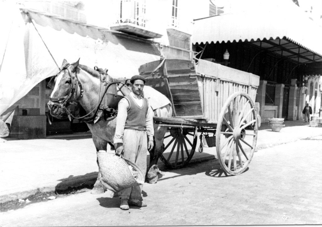 Parat al davant del mercat municipal. Davant del carro hi ha l'escombriaire Manuel Fornas. Al fons es pot veure la marquesina del mercat i apilats els cistells de la brossa de les parades.