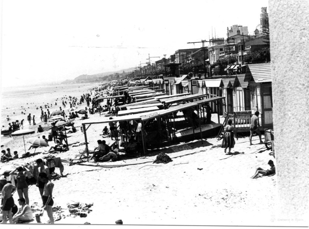 Platja del Masnou plena de banyistes. A la dreta de la imatge hi ha casetes per canviar-se i al centre hi ha instal·lats uns tendals.