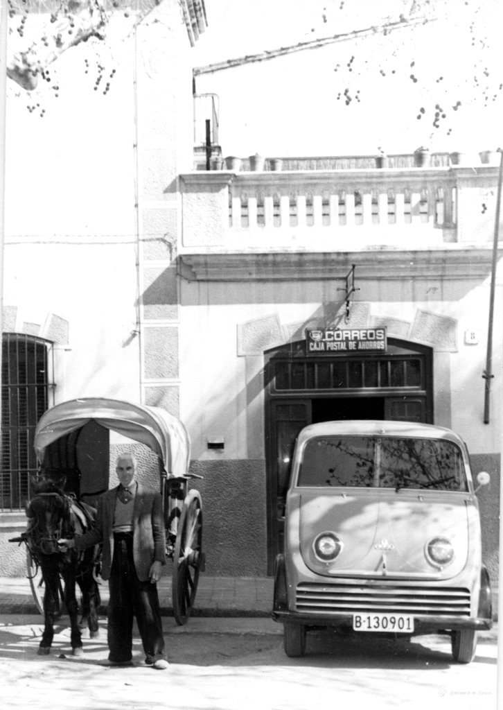 Un carro i una furgoneta aparcats davant la porta de correus a la plaça d'Ocata. L'home es deia Joan Agustí, que treballava a Correus portant sacs de l'estació a Correus.