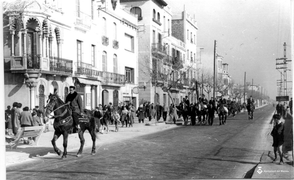 Desfilada dels Tres Tombs per la carretera de Barcelona, en el moment en què passen per davant la Casa de Cultura. Van precedits per un altres genet. La gent els observa des de les voreres.