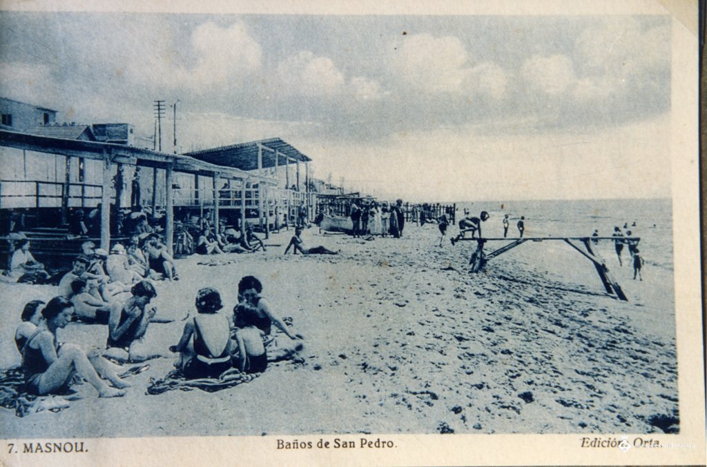 Vista de la platja, amb alguns banyistes a la sorra. A l'esquerra hi ha els Banys de Sant Pere. Prop de l'aigua hi ha instal·lada una plataforma usada pels nens com a trampolí.
