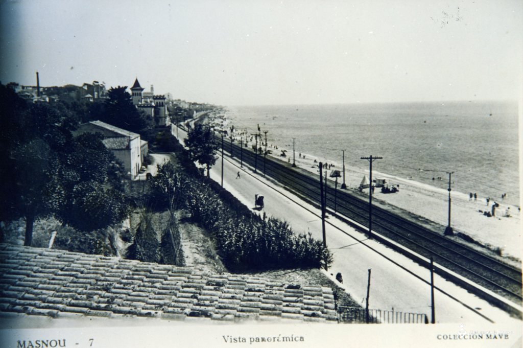 Vista panoràmica de la carretera de Barcelona, de la via i de la platja. Al fons el Castellet (ca l'Aimar).