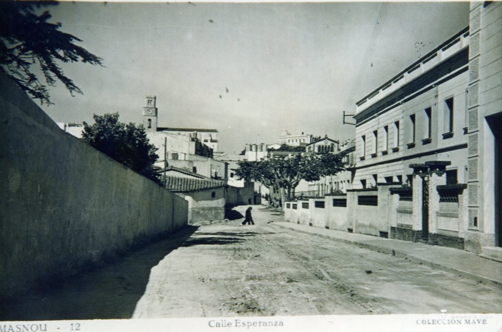 Vista del carrer de l'Esperança. Al fons tenim el campanar de l'església i la Casa Benèfica.