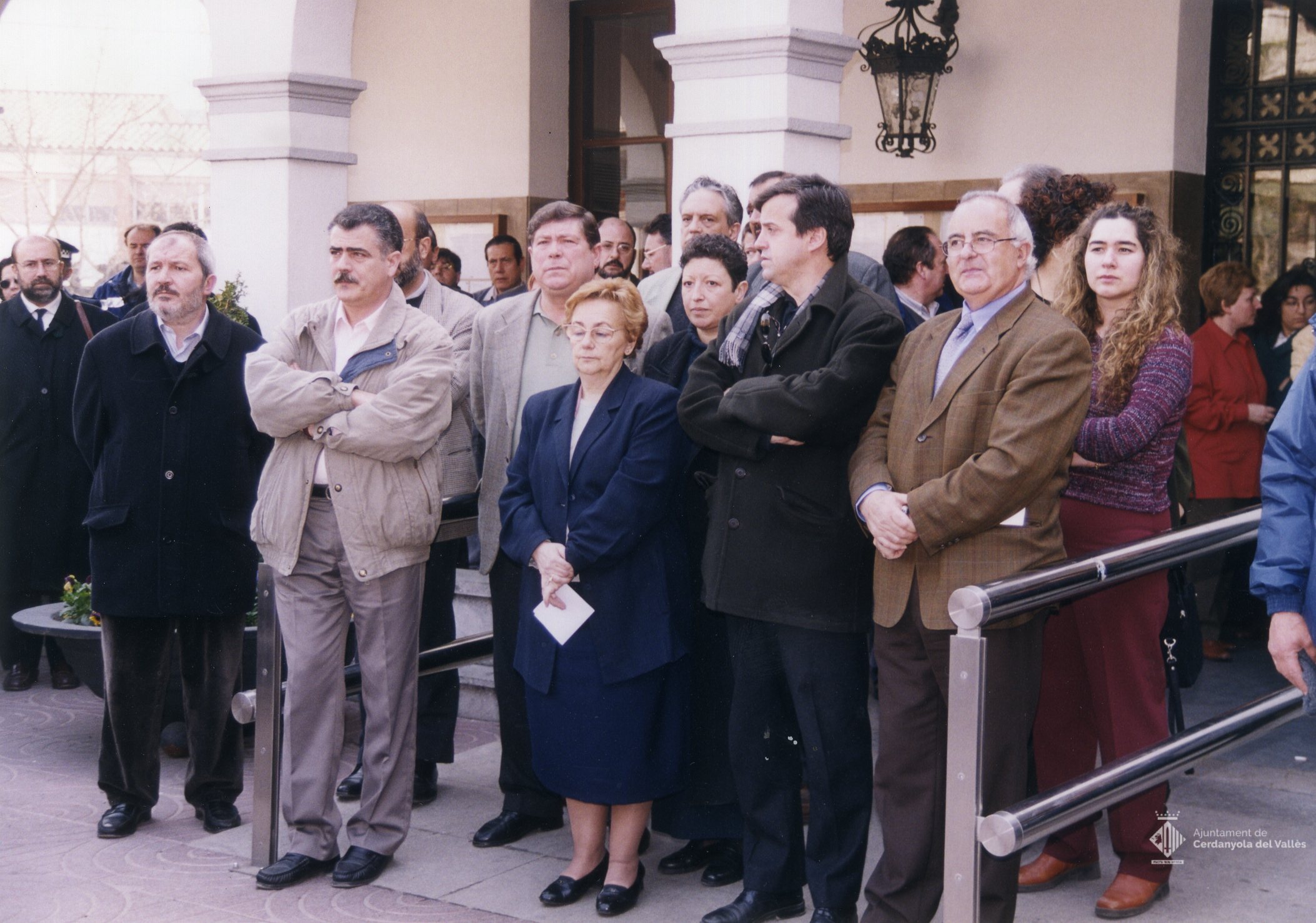 Minut de silenci del personal del consistori davant l'edifici de l'Ajuntament de Cerdanyola del Vallès en protesta per l'assassinat, a mans d'ETA, del diputat Fernando Buesa Blanco i el seu escorta, el policia Jorge Díez Elorza, succeït el 22 de febrer de 2000.