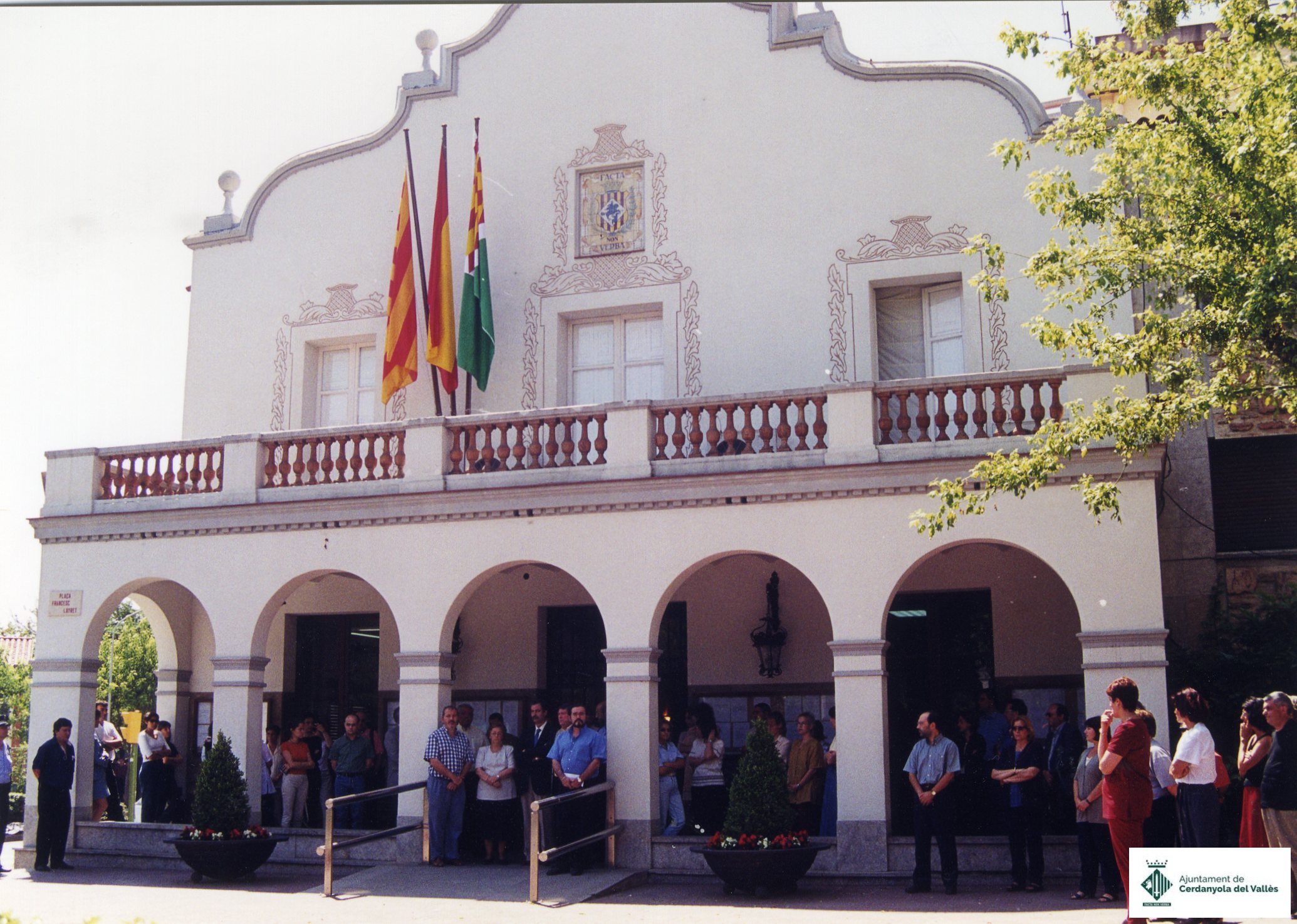 Minut de silenci de l'equip de govern de l'Ajuntament de Cerdanyola del Vallès davant l'edifici del consistori en rebuig a l'assassinat, a mans de la banda terrorista ETA, de Jesús María Pedrosa Urquiza, regidor del Partit Popular a l'Ajuntament de Durango, succeït el 4 de juny de 2000.