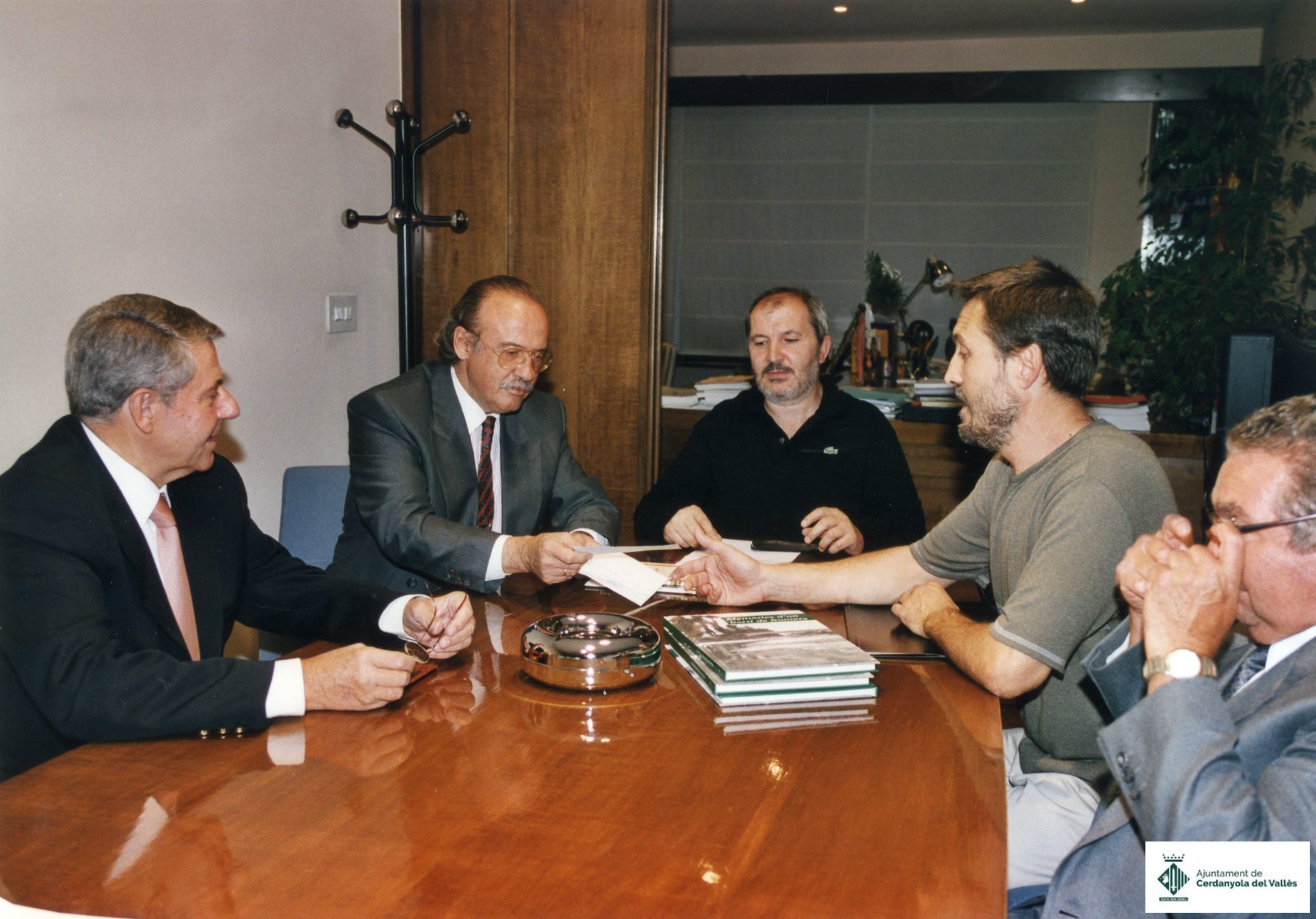 Acte d'entrega de talonari als representants de l'empresa Uralita per la subvenció del llibre ""Memòries d'un barri de frontera"" de mans de Rafael Vinyals i Maymó al despatx d'Alcaldia de l'Ajuntament de Cerdanyola del Vallès el setembre de 2000