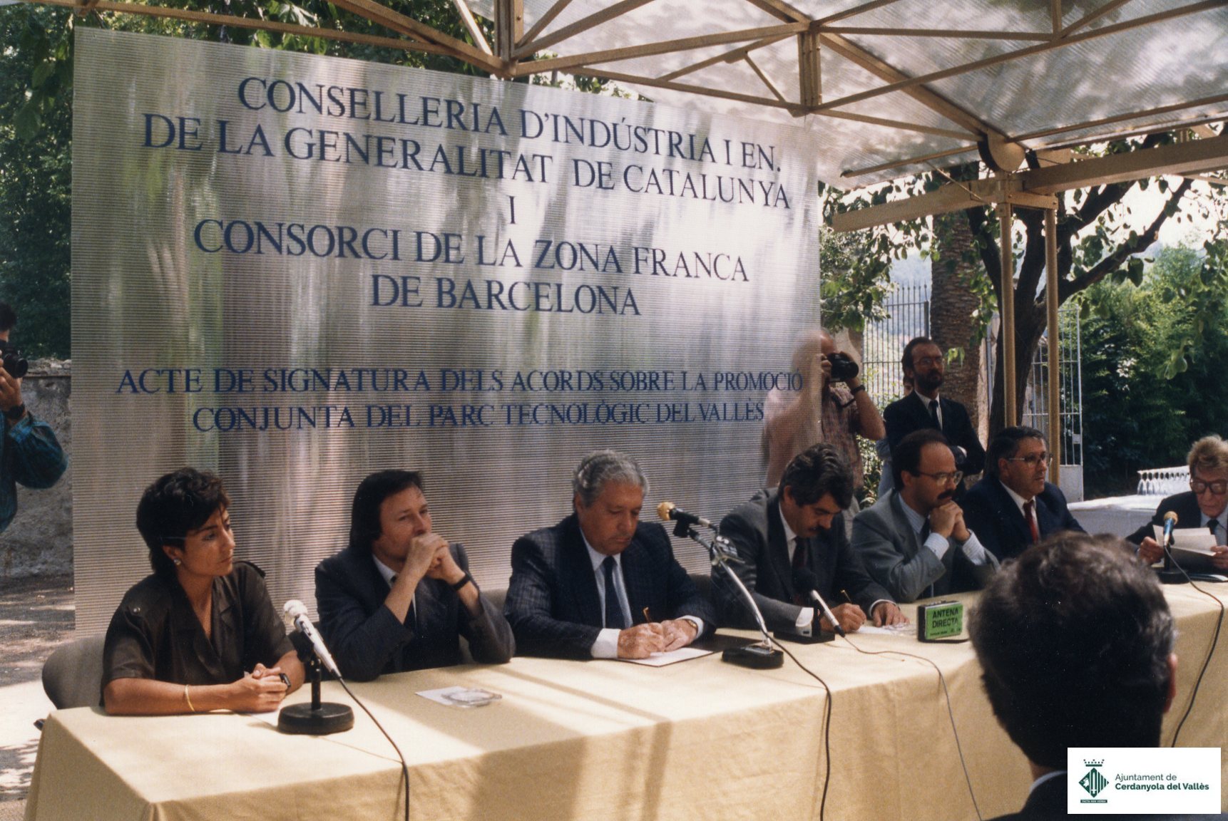 Acte de signatura dels acords sobre la promoció conjunta del Parc Tecnològic del Vallès entre Conselleria d'Indústria i Energia de la Generalitat de Catalunya i Consorci de la Zona Franca de Barcalona celebrat al març de 1990