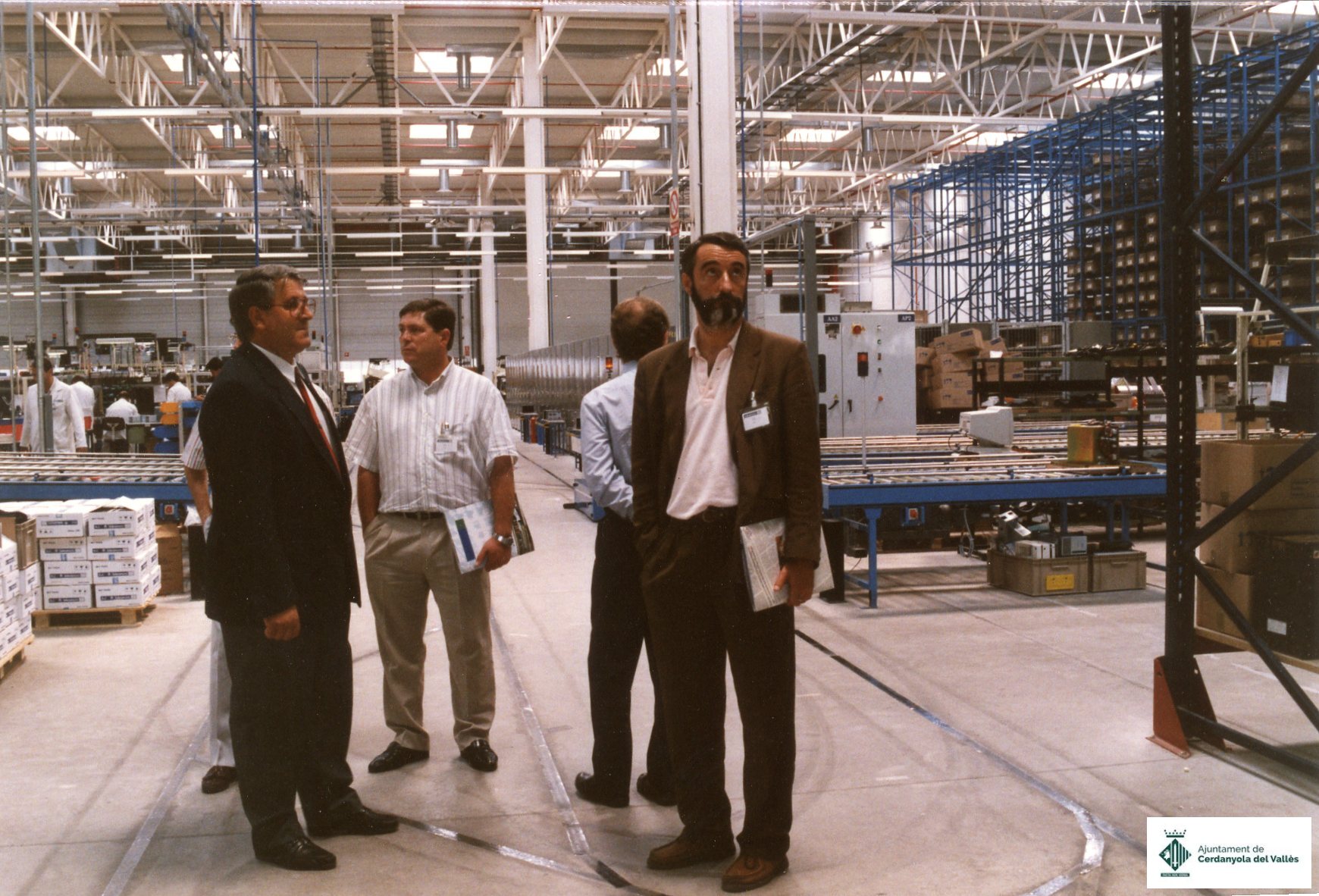 L'alcalde de l'Ajuntament de Cerdanyola del Vallès, Celestino Sánchez González, i els regidors Antonio Rodríguez i Enric Senabre visiten l'empresa TELESINCRO al Parc Teconològic del Vallès el juny de 1990